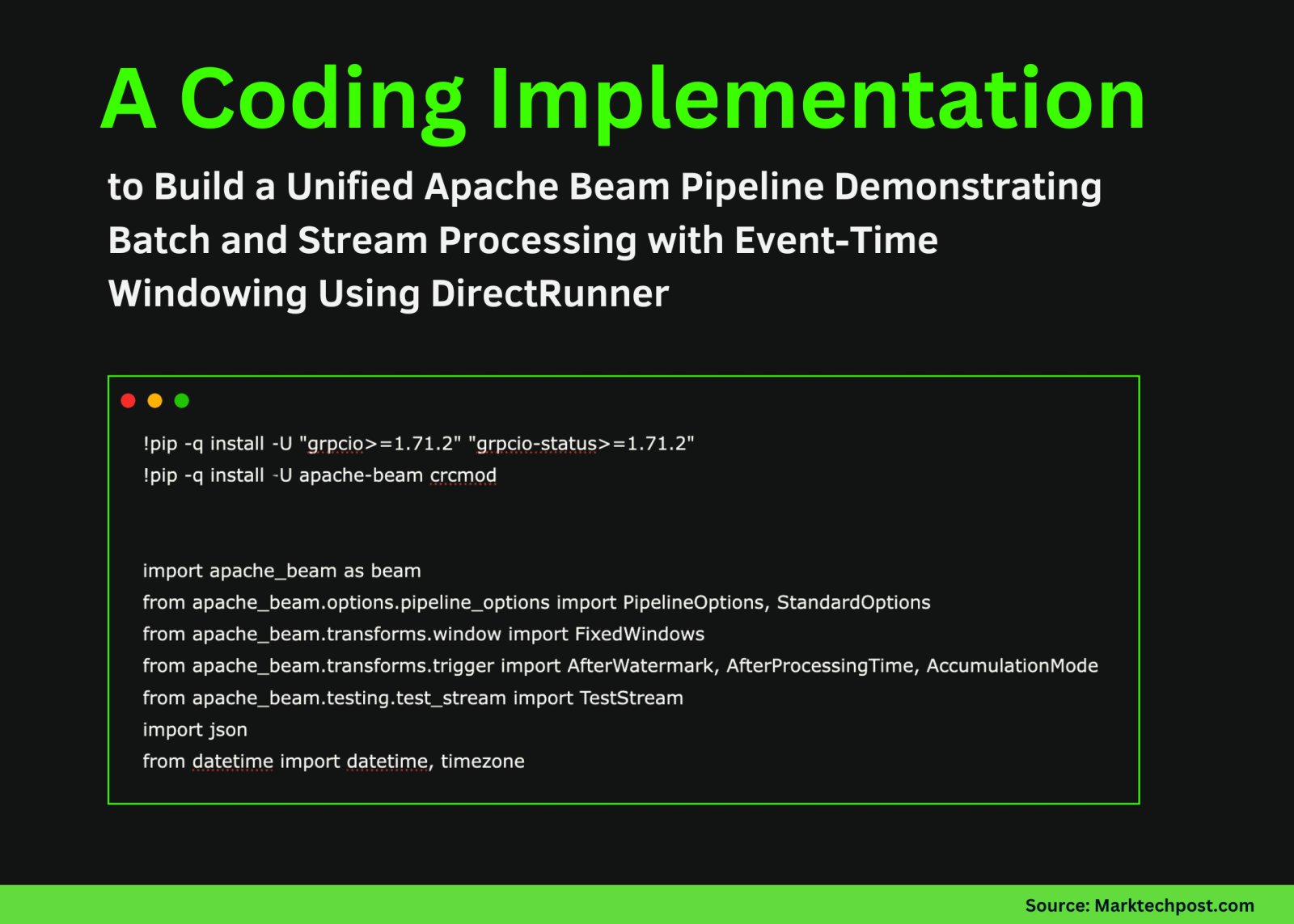 In this tutorial, we demonstrate how to build a unified Apache Beam pipeline that works seamlessly in both batch and stream-like modes using the DirectRunner. We generate synthetic, event-time–aware data and apply fixed windowing with triggers and allowed lateness to demonstrate how Apache Beam consistently handles both on-time and late events. By switching only the input source, we keep the core aggregation logic identical, which helps us clearly understand how Beam’s event-time model, windows, and panes behave without relying on external streaming infrastructure. Check out the FULL CODES here.