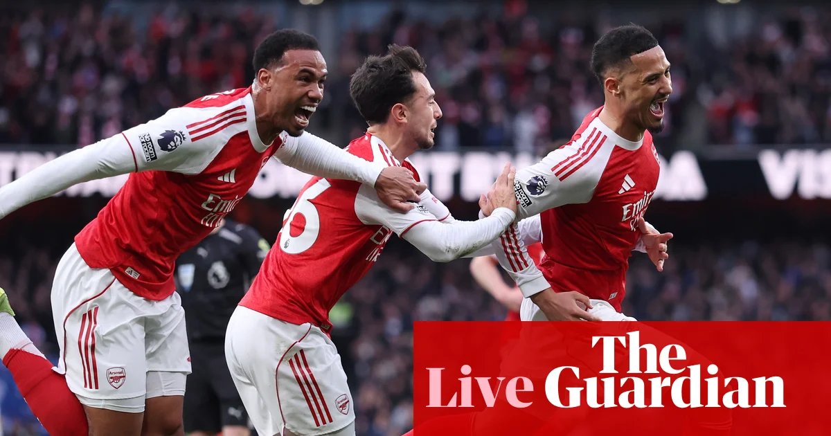 William Saliba of Arsenal scores the opening goal via a deflection from Mamadou Sarr of Chelsea. Photograph: Marc Atkins/Getty ImagesWilliam Saliba of Arsenal celebrates with teammates after scoring. Photograph: Catherine Ivill/AMA/Getty ImagesShare