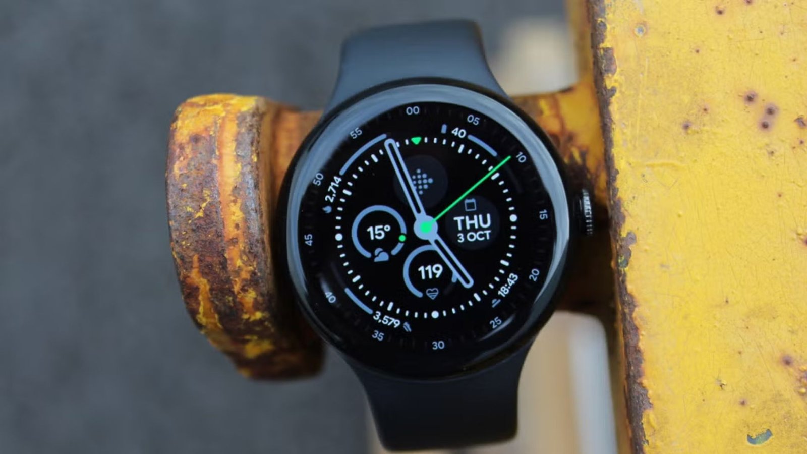 This design is reminiscent of early Fitbit Versa watch faces. Although it seems intended for a more angular watch style, it has worked well on both the Google Pixel Watch 3 and the Samsung Galaxy Watch 8.
