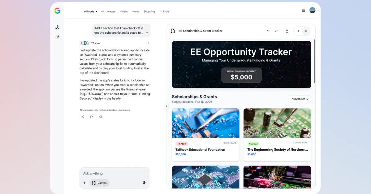 Google is bringing Canvas to everyone in the US using AI Mode in Search. The feature opens up a dedicated workspace within its AI-powered search tool, allowing it to use the latest information from Search to organize plans, develop tools, and draft documents in a panel alongside your chat.