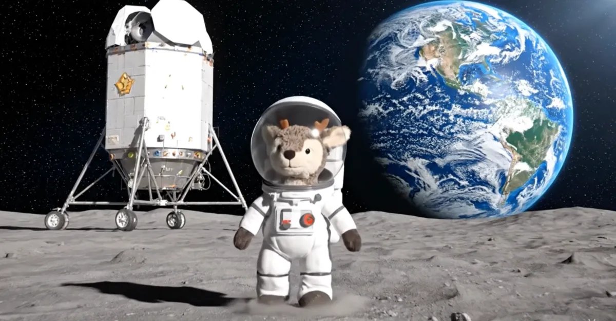 Gemini wouldn’t make a video based on any image of my kid holding the stuffed deer, probably thanks to some welcome guardrails preventing it from generating deepfakes of babies. I started with the only photo I had on hand of Buddy on his own: hanging upside down, air-drying after a trip through the washer. And that’s how he appears in the first clip it generated from this prompt: Temu Buddy hanging upside down in space before dropping into place, morphing into a right-side-up astronaut, and delivering the dialogue I requested.