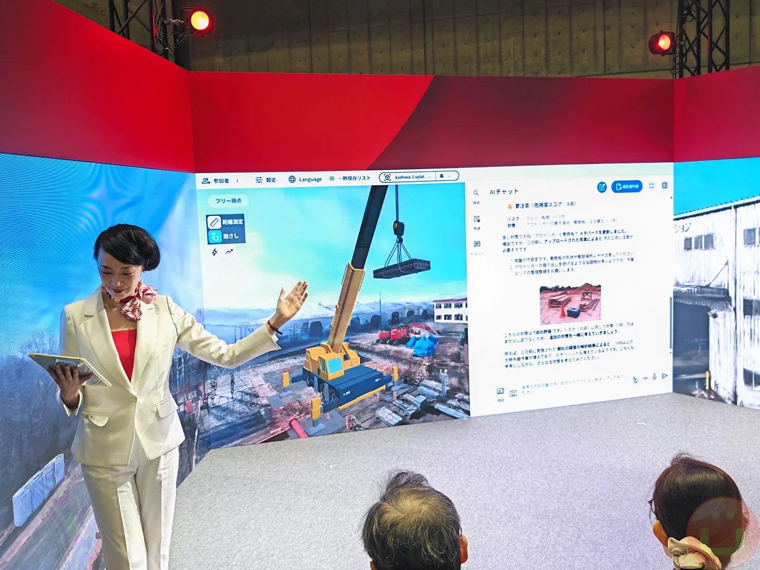 Large-format displays and Japanese-language panels described Naivy as a “Frontline Coordinator”, operating within an on-site extended metaverse that mirrors an actual factory. Diagrams shown on the main screen position Naivy at the center of a layered system that connects the physical site, accumulated field knowledge, AI reasoning, and human decision-making. Naivy is meant to support workers on location, not replace them or automate decisions without oversight.