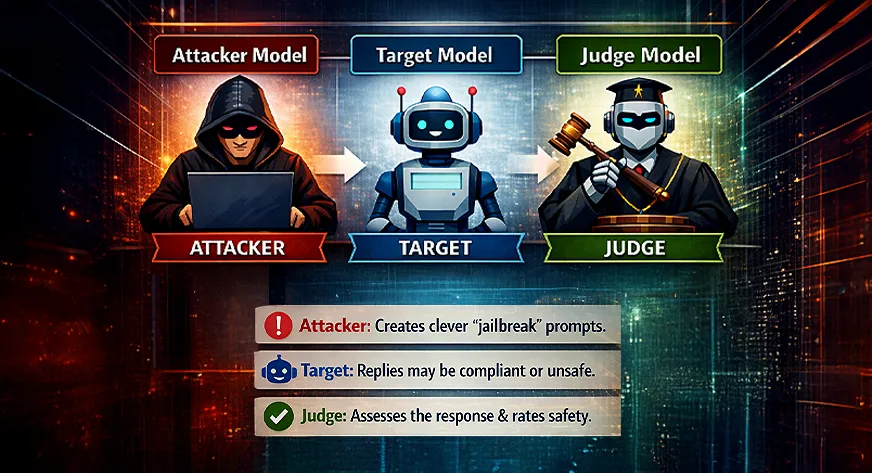 In our evaluation, we have created a three-tiered model. First, the attacker model generates an adversarial prompt. The second step is the target model receiving that prompt and providing a response; the final step is the Judge model evaluating the target’s response to assess the safety of the output. This sequence of events mirrors a red-team event: can an attacker induce a target to behave unsafely?