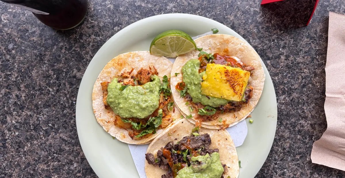 Tacos Chukis is familiar to me but I’d never been. I almost walked by the place, since it’s tucked into the back of a building with a half-dozen other retail shops and no sign on the sidewalk. But Gemini steered me to the right spot, and right on time: It had only opened up 15 minutes before I walked in. My AI itinerary hinted that the house specialty with grilled pineapple was a popular choice, and I found out why. Three excellent tacos later, it was time to head to my next stop.