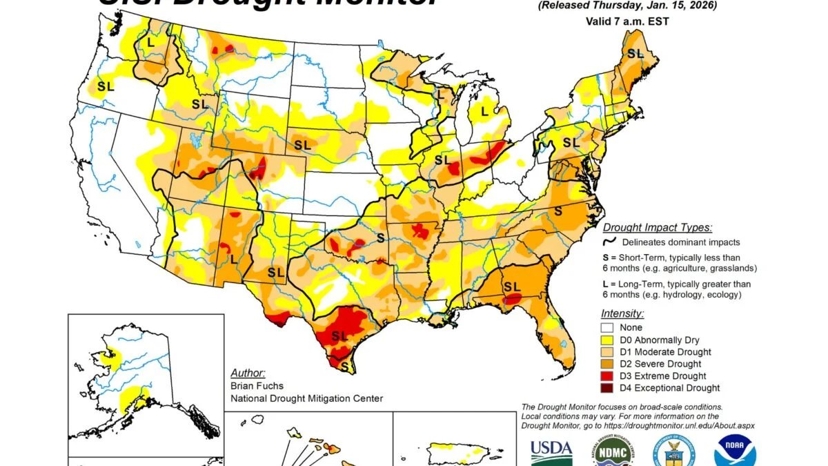 Fast-forward to January 2026—conditions aren’t looking any better. As of January 13, 39 states from Maine to Hawaii were experiencing drought conditions ranging from severe to exceptional, according to Drought.gov. At that time, these conditions covered 35.66% of the U.S. and Puerto Rico, or 42.55% of the Lower 48 states.