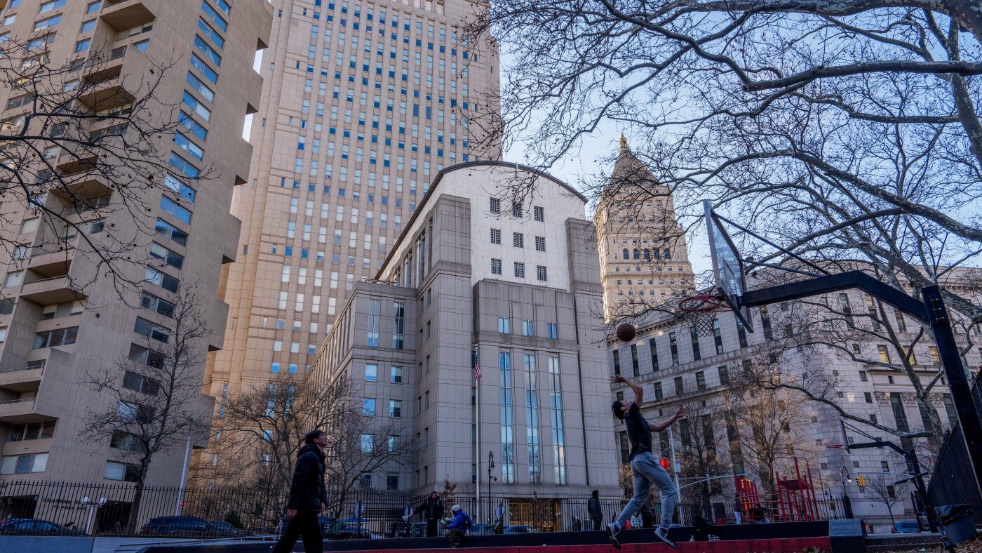 People play basketball in front of Daniel Patrick Moynihan United States Courthouse in New York City on Sunday. Maduro is set to make his first court appearance on Monday.