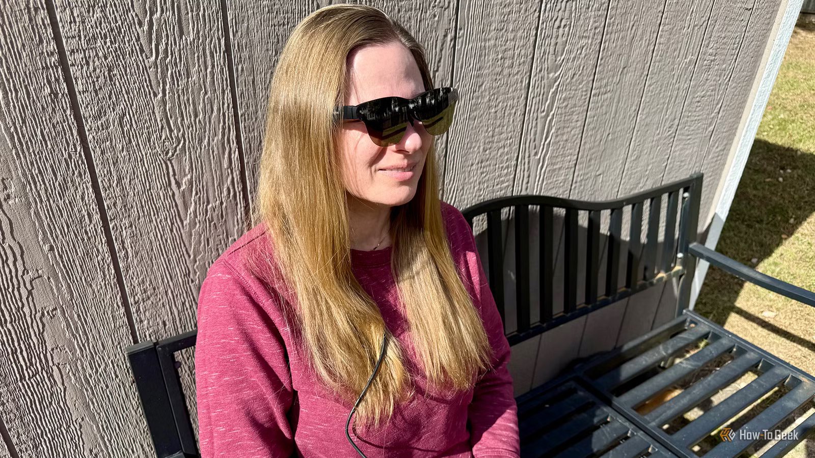 Unlike more expensive AR/XR glasses, there’s no light-blocking electrochromic film. Instead, sunglasses-like shades are placed in front of the lenses. Unfortunately, these do let some light through, so if you’re in a bright environment, inside or out, the video you see will appear to be faded and superimposed. Similarly, the glossy materials do pick up reflections, particularly from behind you. For best content viewing results, you really want to be in a darkened environment with no light source in front.